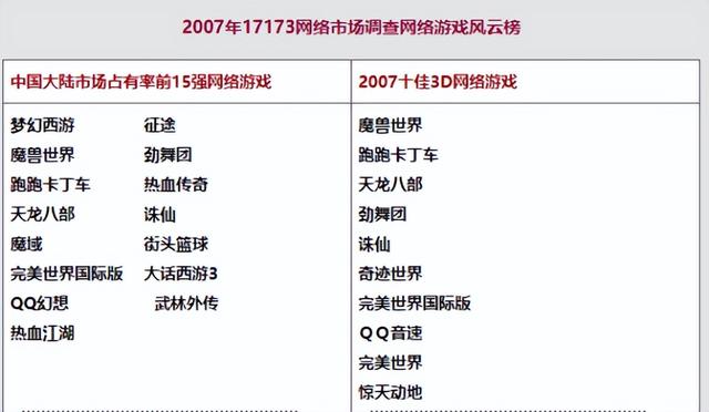 2007年这一年,国产游戏迅速崛起,并日益受到玩家的推崇。2006年,“中国大陆市场占有率前15强网络游戏”前三甲均被国外游戏垄断,2007年市场占有率中的冠军和亚军则都是国产游戏。整个榜单中,国产网游更占据了近三分之二的份额,如《征途》、《梦幻西游》、《天龙八部》、《完美世界国际版》等。