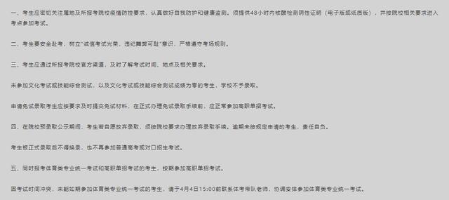 五、同时报考体育类专业统一考试和高职单招考试的考生,按期参加高职单招考试。因考试时间冲突,未能如期参加体育类专业统一考试的考生,请于4月4日15:00前联系体考带队老师,协调安排参加体育类专业统一考试。