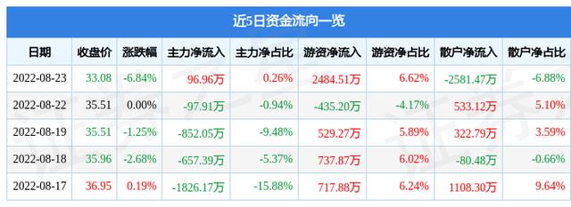 资金流向数据方面,8月23日主力资金净流入96.96万元,游资资金净流入2484.51万元,散户资金净流出2581.47万元。