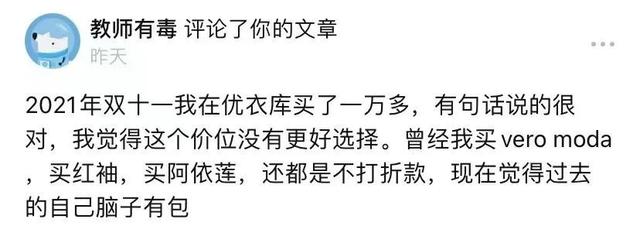 有位网友的留言,看了很心痛,前不久双11,他在优衣库买了1万多元,觉得自己以前买VM、红袖、阿依莲等品牌是脑子有包;