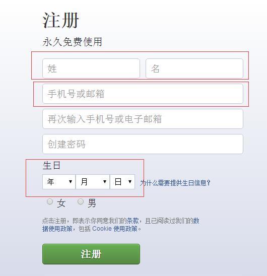 访问成功以后,接下来就是注册账号,账号注册的时候主要是填四个信息:姓名、邮箱或者手机号、密码、生日。