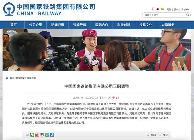 2022年7月22日上午,中国国家铁路集团有限公司召开中层以上管理人员大会。中央组织部有关负责同志宣布了中央关于中国国家铁路集团有限公司正职调整的决定:刘振芳同志任中国国家铁路集团有限公司董事长、党组书记,免去其交通运输部党组成员,国家铁路局局长、党组书记职务;免去陆东福同志的中国国家铁路集团有限公司董事长、党组书记职务;郭竹学同志任中国国家铁路集团有限公司董事、总经理、党组副书记;免去杨宇栋同志的中国国家铁路集团有限公司董事、总经理、党组副书记职务,另有任用。相关职务任免按有关法律和章程的规定办理。