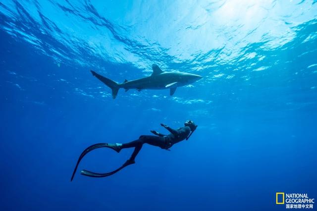 在巴哈马,一名潜水员和一头远洋白鳍鲨一起游弋。鲨鱼旅游业在世界各地越来越受欢迎,为儿童提供了一个参与鲨鱼保护的机会。撰文:RACHEL NG