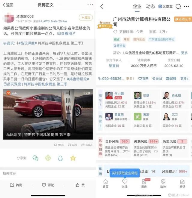一张“企查查”截图,配以相关的诽谤,在以微博为代表的社交媒体上,有序地、渐进地,通过一些刻意安排的节点扩散和传播,意指特斯拉在中国的“友商”——小鹏汽车及其创始人何小鹏先生,持有品玩的运营主体——北京品西互动科技有限公司的股份,进而暗示品玩《特斯拉中国乱象揭蛊 第三季》一文背后有“不可告人”的利益关系。