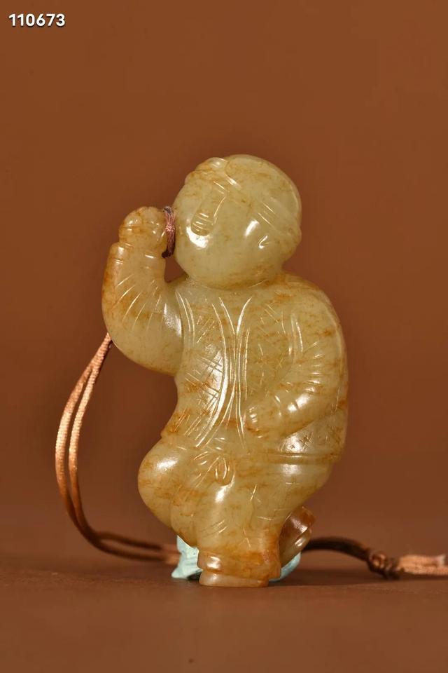 清代 和田玉童子把件 规格:高7.1cm 宽4cm 厚1.9cm重81克 玉质细腻,通体满沁,色泽迷人,整料采雕童子,活灵活现,比例协调,味道足,皮壳厚重,把玩收藏极佳。