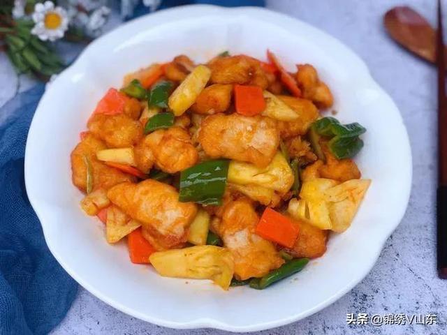 准备食材:鸡胸脯肉250克,菠萝250克,鸡蛋清75克,白菜40克,淀粉(蚕豆)10克,柿子椒40克,泡椒10克,猪油(炼制)50克,盐3克,味精1克。
