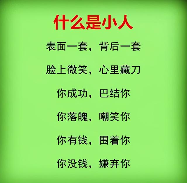 看得出来,这样的小人非常势利,你有利用价值的时候好言好语,当在你身上拿不到利益了,就会瞬间换了另一副面孔;表面光明正大,暗地里阴险狡诈。如果你的“心机”不够,那么小小的疏忽就会让你落入到他们的圈套里。