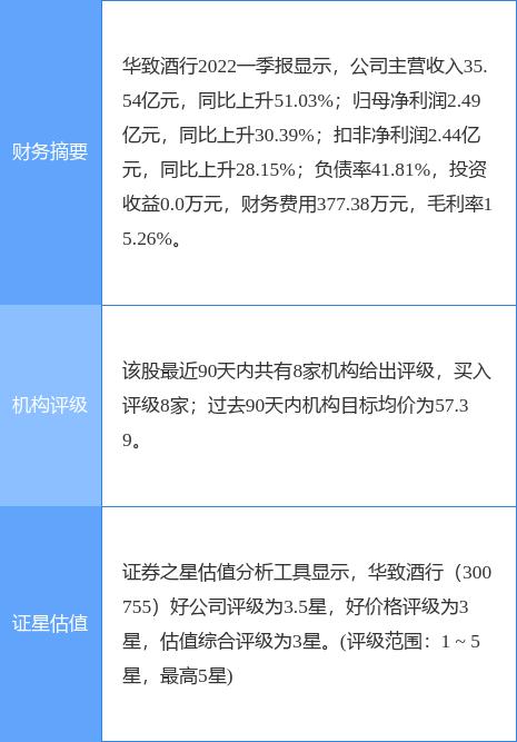 2022年4月20日,浙商证券研究员杨骥,张潇倩发布了对华致酒行的研报《华致酒行2022年一季报点评:收入端表现亮眼,看好精品酒贡献利润弹性》,该研报对华致酒行给出“买入”评级。研报中预计2022~2024年公司收入增速分别为31.8%、27.3%、23.7%;归母净利润增速分别为43.4%、29.2%、26.7%;EPS分别为2.3、3.0、3.8元/股;PE分别为16、12、10倍,维持买入评级。证券之星数据中心根据近三年发布的研报数据计算,该研报作者对此股的盈利预测准确度为98.1%。