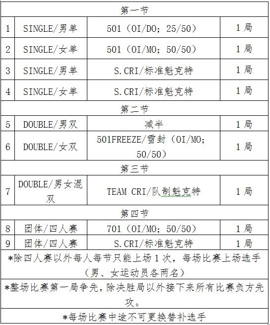 1. 男子/女子个人锦标赛均采用501(OI/MO、50/50)/ S.CRI/自选3局2胜单淘汰赛制。决赛为5局3胜。