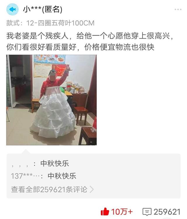 9月8日,一家服装网店下的数月前评论,突然引起网友的关注。该评论称:“我老婆是个残疾人,圆她一个(穿婚纱的)心愿,她穿上很高兴,你们看很好看。质量好,价格便宜,物流快。”评价还附上了他妻子试穿的照片。照片中的女子身材瘦弱,穿着睡衣,在睡衣外面套着丈夫购买的白色“婚纱”,对着镜头笑得很开心。不少网友被这张毫无摄影技巧的婚纱照打动,短短一天时间,二十多万网友在这条评论下点赞留下祝福。有网友说:“几十块的婚纱和十几万的婚纱一样洁白。”“裙子有价爱无价”……