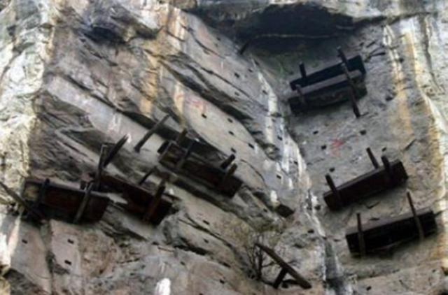 悬棺中最主要的置棺方式是木桩式,岩壁中嵌入木桩,棺木置于木桩之上。这些放置悬棺的绝壁连放脚的地方都难寻,那么,当年僰人是如何做到的,他们为何要这么做?