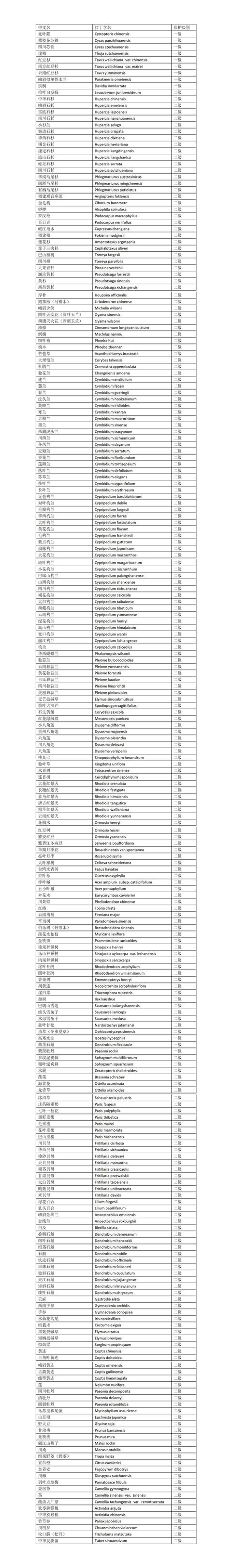 据省林草局梳理,《名录》中,四川天然原生的国家重点保护野生植物有231种(藻类0种、真菌3种、苔藓植物3种、石松类和蕨类植物21种、裸子植物18种、被子植物186种),见下表。