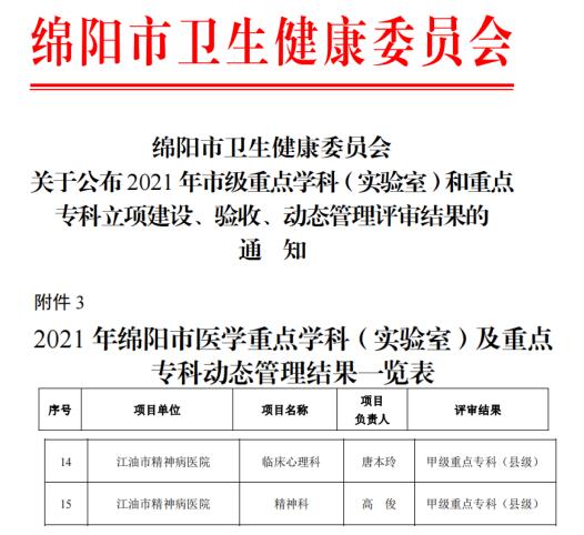 近日,绵阳市卫生健康委员会发布《关于公布2021年市级重点学科(实验室)和重点专科立项建设、验收、动态管理评审结果》通知,江油市精神病医院精神科与临床心理科两个绵阳市甲级重点专科均通过此次动态管理评审。