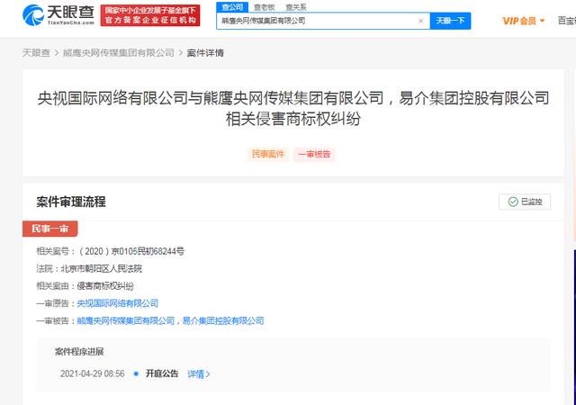 据天眼查APP显示,近日,央视国际网络有限公司与熊鹰央网传媒集团有限公司、易介集团控股有限公司相关侵害商标权纠纷案开庭,案号(2020)京0105民初68244号,审理法院为北京市朝阳区人民法院。一审原告为央视国际网络有限公司(央视网关联公司),被告为熊鹰央网传媒集团有限公司、易介集团控股有限公司。