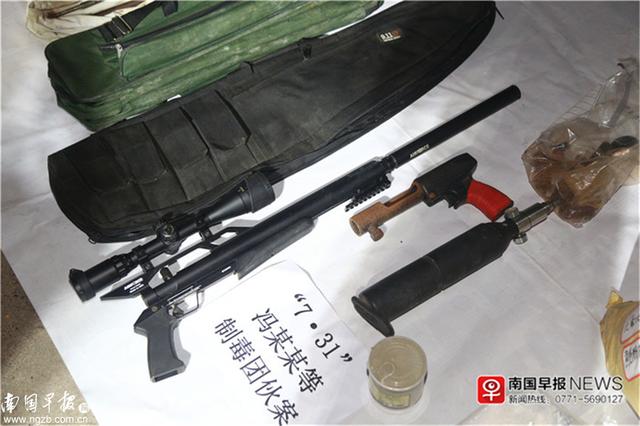 五一西路翠湖新城小区前广场,警方展示收缴到的涉案工具和毒品。