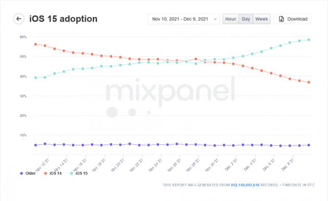 根据第三方网站Mixpanel的数据,iOS 15在2021年6月正式向公众发布后的80天内,目前在所有iOS设备中的采用率接近60%。截至周四,第三方数据分析公司Mixpanel表示,大约58%的iOS设备正在运行iOS 15,而运行iOS 14的设备约为36%。Mixpanel此前表示,iOS 15的采用率比iOS 14在去年秋季发布时要慢。