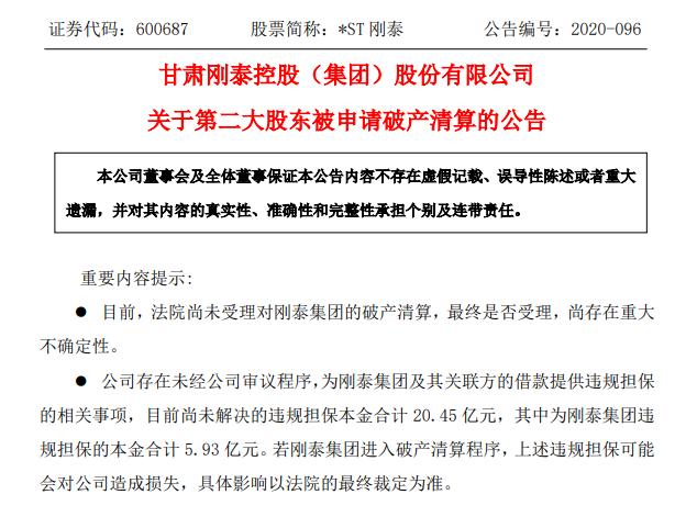 *ST刚泰称,若刚泰集团进入破产清算程序,上述违规担保可能会对公司造成损失,具体影响以法院的最终裁定为准。