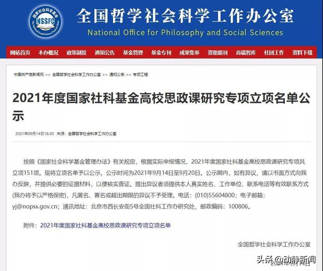 9月14日,全国哲学社会科学工作办公室发布《2021年度国家社科基金高校思政课研究专项立项名单公示》。按照《国家社会科学基金管理办法》有关规定,根据实际申报情况,2021年度国家社科基金高校思政课研究专项共立项151项。现将立项名单予以公示,公示时间为2021年9月14日至9月20日。