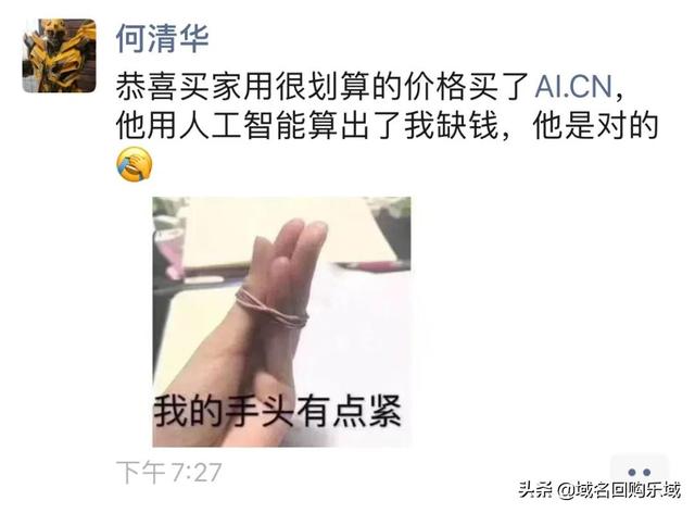 AI.cn据域名投资人何清华爆料:“恭喜买家用很划算的价格买了AI.cn。”AI是人工智能的缩写,也是近年来比较热门的话题,也有中文“爱、艾”等含义,中英文释义都很不错。