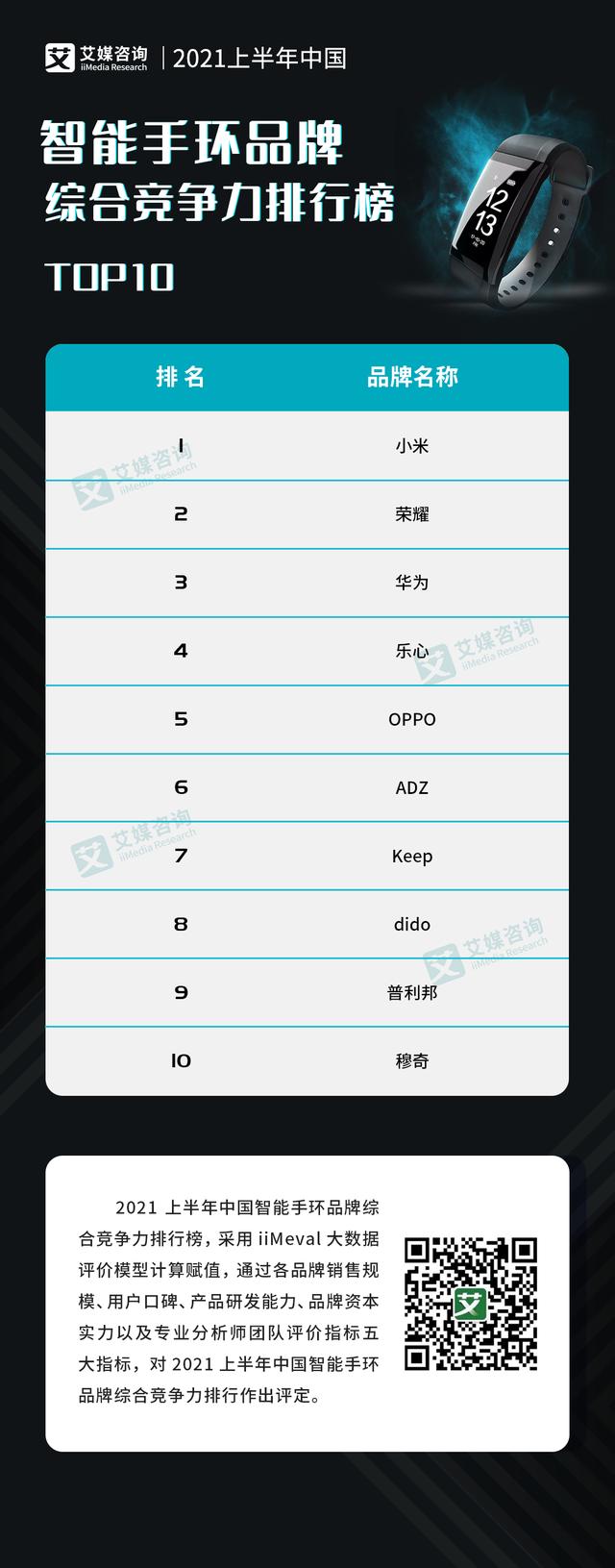 在《2021上半年智能手环品牌综合竞争力排行榜》中,小米、荣耀、华为分列前三,乐心、OPPO紧随其后。随着技术的进一步成熟,智能手环除了提供日常信息呈现、体征数据监测,功能逐渐覆盖支付、出行等多样场景,进一步延展其产品生态能力。中国智能手环市场正处于增长期,其产品强大的实用性和人们愈发强烈的健康意识提供的驱动力使得市场继续增长成为可能。