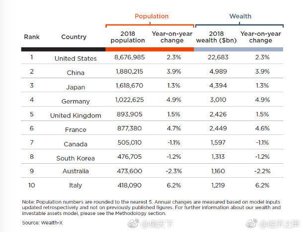 [哪些国家有钱人最多?中国排全球第二]据CNBC17日报道,美国财富研究公司Wealth-X统计了2018年各国高净值(HNW)人群数量,中国以188万高净值人群数位列第二,次于美国的868万人。该公司将HNW定义为净资产在100万到300