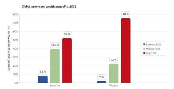 根据《世界不平等报告》,2021年,全球一个成年人的平均年收入为16700欧元,而收入最高的10%的人年人均收入为87200欧元,收入位于50%以下的人口平均一年只赚2800欧元。从财富规模来说,收入底层的全球50%的人口只拥有全球总财富的2%,而最有钱的10%人口则拥有76%。过去的25年里,最富有的52个人的财富规模每年增长9.2%,远远高于社会均速。