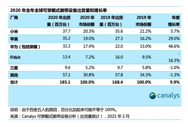 说出来你们可能不信,其实早在Canalys统计的2020全年全球穿戴腕式设备出货统计上,小米就已经是当时的全球第一,只是这个季度两者的差距越发缩小。