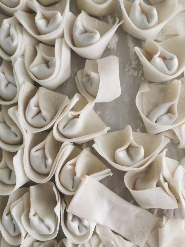 3、买的现成的馄饨皮,加入肉馅