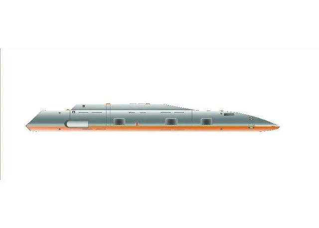 潜艇长度75米,最大宽度11米,高度6.6米,水下排水量3800吨,燃气轮机水面推进,水下采用热离子动力驱动。