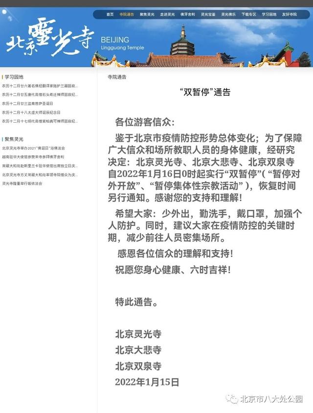 通告 根据北京灵光寺官方消息,鉴于我市疫情防控总体变化,为保障广大信众和场所教职人员的身体健康,自2022年1月16日零时起二处灵光寺、四处大悲寺暂停对外开放、暂停集体性宗教活动,恢复时间另行通知。敬请您予以理解和支持! 来源 北京市八大处