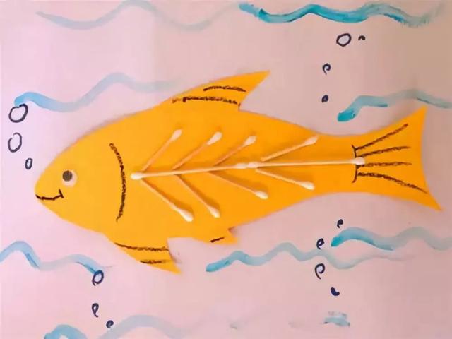 给小鱼添画上漂亮的花纹。你将棉签变成小鱼的骨头,想画成什么样的呢?发挥你的想象力吧!