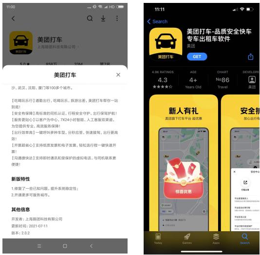 美团打车上线安卓应用市场(左)和苹果商店(右)