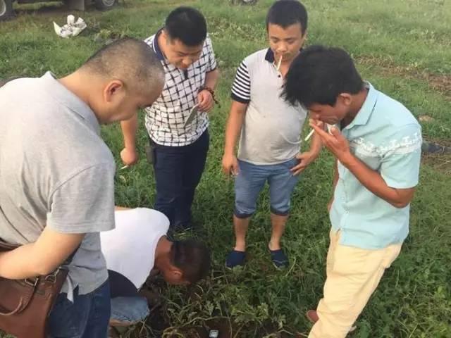 业务员和经销商上前一边测土壤酸碱度一边一条一条的挖出瓜藤的根,开始向农户讲解试验地最后一批瓜不但大小均匀而且依然甜润靓丽的原因——根结线虫病被解决,西瓜的钙质含量丰富!