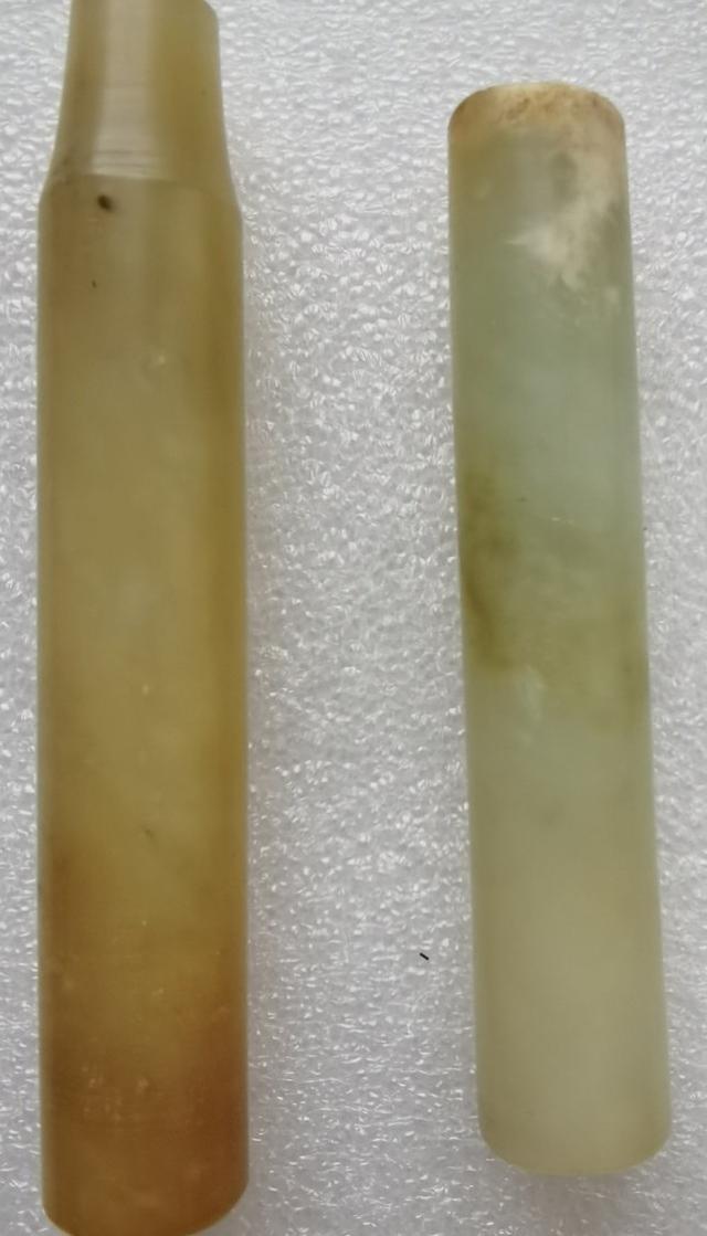和田玉烟嘴过去并不是什么稀罕玩意儿。但凡是小康人家,爱抽旱烟的人都讲究用白玉嘴,乌木杆,白铜锅的烟袋。只有大富大贵之人,才用得起翡翠嘴。 下面这两只玉烟嘴残件,虽然不是白玉,但是青白玉也是不错的。玉嘴温润,坚硬,冬暖夏凉,非常亲和人体。我保