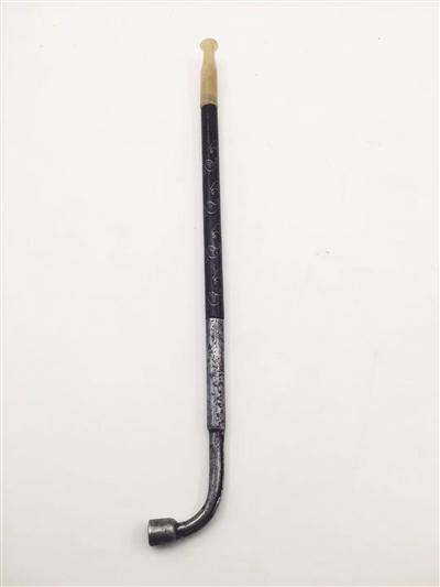 这个烟嘴的材质是黄玉,年代应该是清代的。在清代,制作烟嘴的材质以白玉、翠玉为上品,黄玉也存在,其中玛瑙次之。这个烟嘴上的图案应该是草叶纹,这可能与烟具是草原文化的产物有关系,草原人们比较崇尚自然。这个烟嘴做工精美、雕刻手法精湛,是清代烟嘴中的精品。烟锅则由黄铜错红铜、错白铜工艺制作而成,烟杆錾有花草纹,虽为实用品但做工精细,也为民俗藏品中的精品,带有典型的蒙古族民族特色。汉族使用的烟锅通常为单色铜所制,蒙古族所用烟锅喜欢用多色。(文/图 呼和浩特晚报记者 马妍)