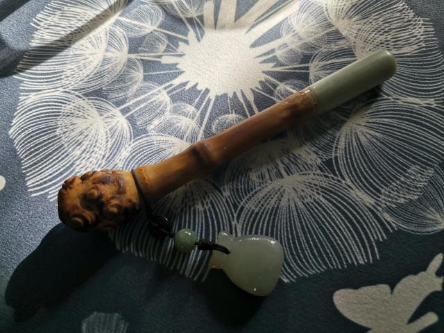 应老王要求,给他的小竹根烟斗做了小挂饰,拴一个玉石的钱袋子。然后老王拿着这个烟嘴儿抽烟,(其实是炫耀自己的手工)别人问起来给人讲解一番,再听上几句夸赞,老王心里美美哒。[呲牙]
