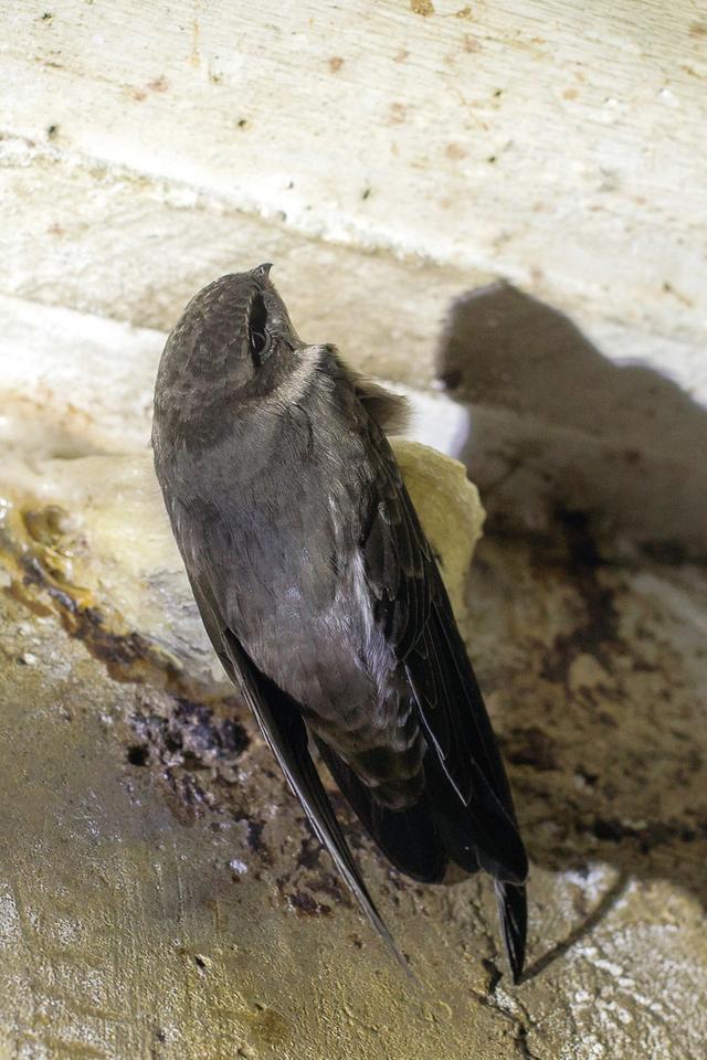 爪哇金丝燕比较突出的特点是躯体上部的黑褐色羽毛中有金丝光泽