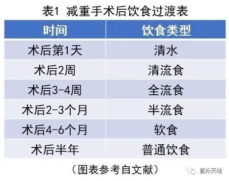 减重手术后饮食应逐渐过渡,遵循:水→清流质→全流食→半流食→软食→普通饮食的顺序。减重手术的饮食过渡建议如表1。过渡过程中如果发生明显不适,应回到上一阶段并维持1周左右再重新开始过渡。