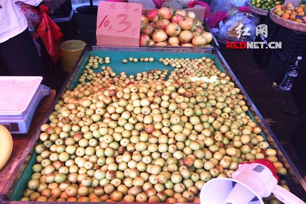 (长沙红星大市场内,不少卖家都将鲜枣价位定在10元3斤。)
