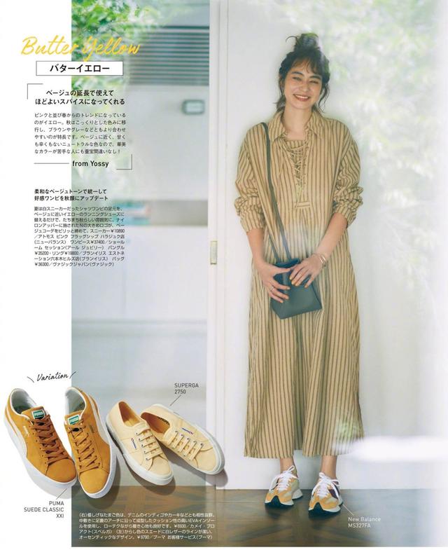 一、裙装+运动鞋一提到连衣裙,大家想到的都是优雅高级的代名词,其实除了把连衣裙穿得优雅与精致之外,也可以穿的大方又有活力,这时候只需要搭配上一双运动鞋就可以做到。这身黄色竖条纹衬衫连衣裙,配上黄色运动鞋的造型当中,上下身颜色形成呼应,看上去有着协调美感。