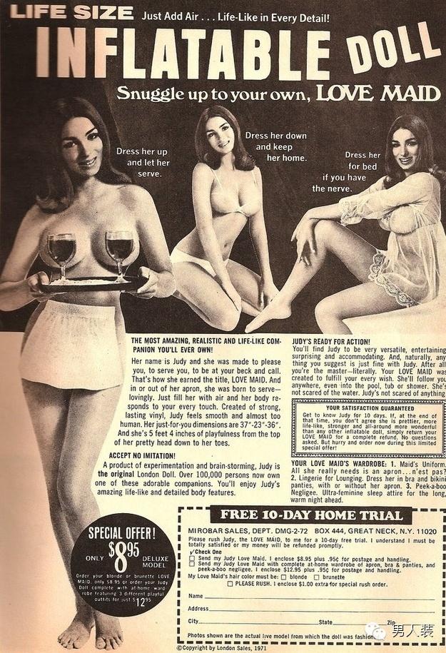 早在1971年,那时候的商家就开始在报纸等媒体上刊登广告欺诈男屌丝了。真人大小的充气娃娃。爱的女仆“茱蒂”。你为她梳妆打扮,她供你解决生理需要。茱蒂拥有人类般细腻光滑的肌肤,身上的每一处都和真人一样,她就是这样栩栩如生,楚楚动人。再加4元,即可获得超值的女仆套装,包括超性感的睡衣一套。现在,已经有超过十万人拥有了茱蒂,不用998,只需8.95刀,女仆茱蒂抱回家。