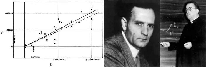 图1. 反映遥远星系的退行速度v与它们离地球的距离D成正比关系的定律,v =H0×D(左图,来自参考文献[1]),在2018年10月经国际天文联合会表决通过由原名哈勃定律改为哈勃(中图)–勒梅特(右图)定律, 以表示认可梅勒特在发现这一定律方面的贡献。