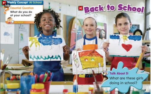 从我们目前所学来看,内容量也不太大,每次课相当于2-6页纸的绘本,涉及到听、说、读,类似绘本精读,老师读一遍,孩子跟读,然后对话,单词学习,提问,阅读,语法等。