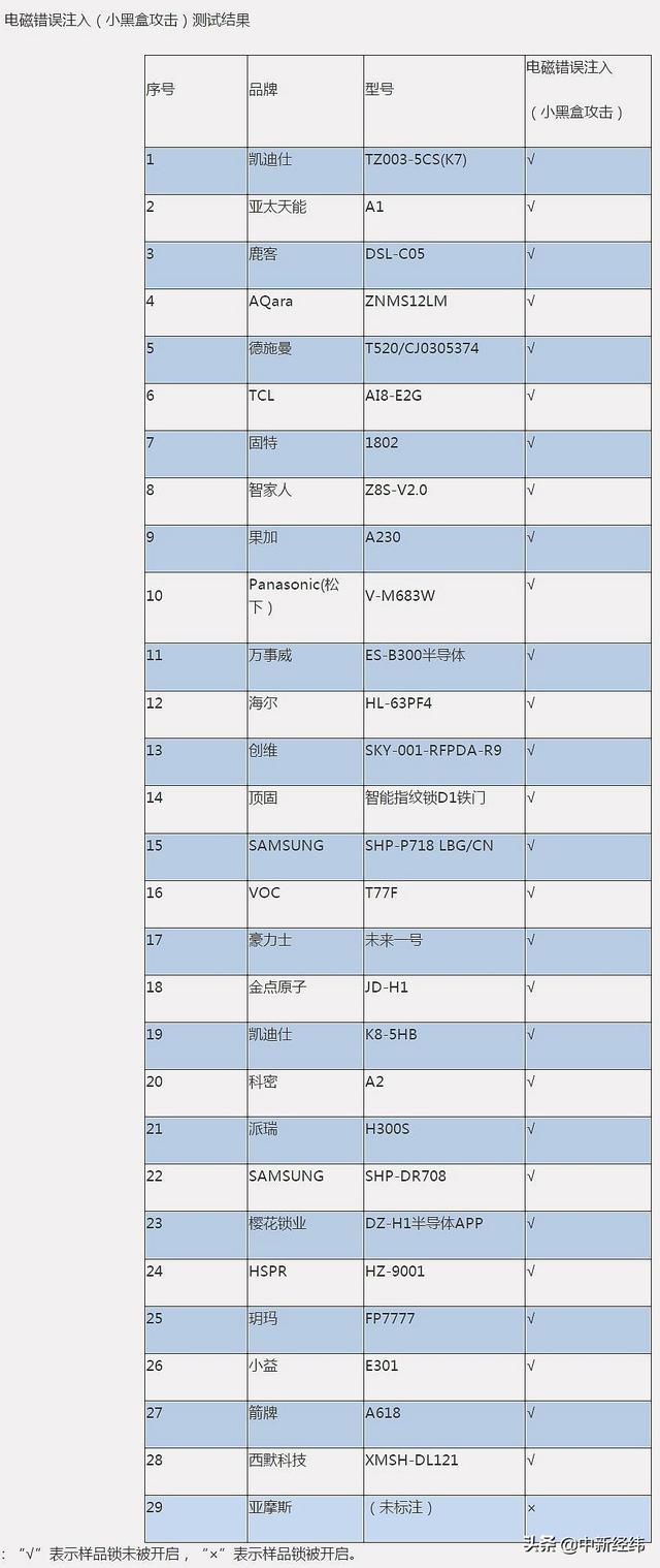 中消协介绍,所谓“小黑盒攻击”即电磁错误注入技术,指当给智能门锁施加强电磁场情况下,门锁可以出现故障报警、系统锁定、电路损坏等现象。为验证“小黑盒秒开智能门锁”的传闻,中消协选取了比《电子防盗锁标准》场强50V/m高出30倍的强力电磁场强,对29款样品进行了测试。
